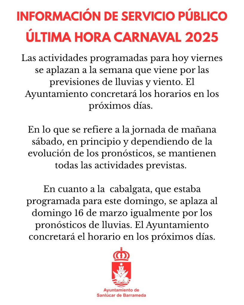Las actividades del Carnaval de Sanlúcar programadas para hoy viernes se aplazan a la semana que viene por las previsiones de lluvias y viento. El Ayuntamiento concretará los horarios en los próximos días.